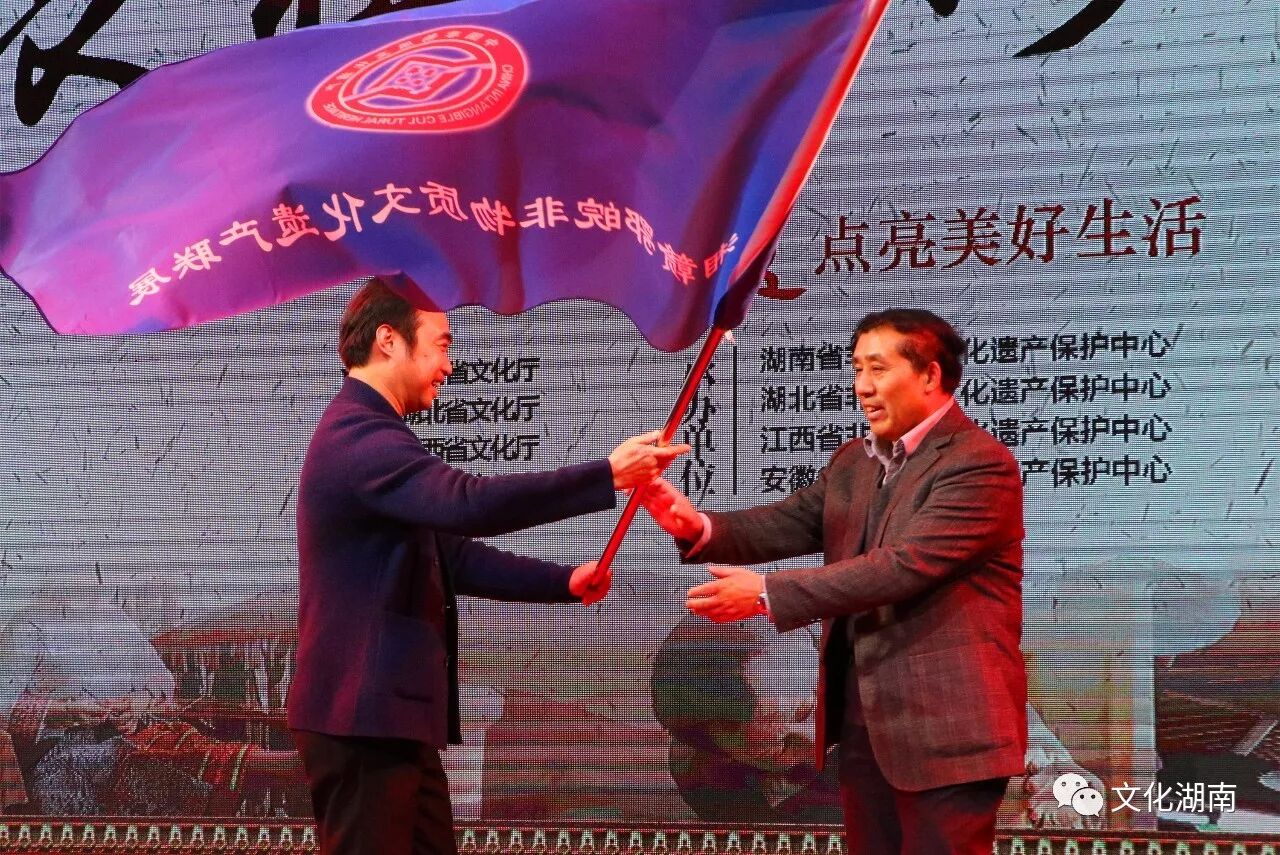 婉转啁啾的湖南民歌《水腔》、热情洋溢的湖北长阳山歌《唱个山歌甩过来》、高亢嘹亮的徽州民歌《四季探妹》……12月24日晚,在来自湘赣鄂皖四省的民歌传承人嘹亮优美的歌声中,第三届湘赣鄂皖非物质文化遗产联展圆满落下帷幕。湖南省文化厅党组成员、副厅长张帆观看演出并将四省非遗联展活动展旗传递给安徽省文化厅党组成员、文物局局长何长风。第四届湘赣鄂皖非遗联展将于2019年在安徽举行。